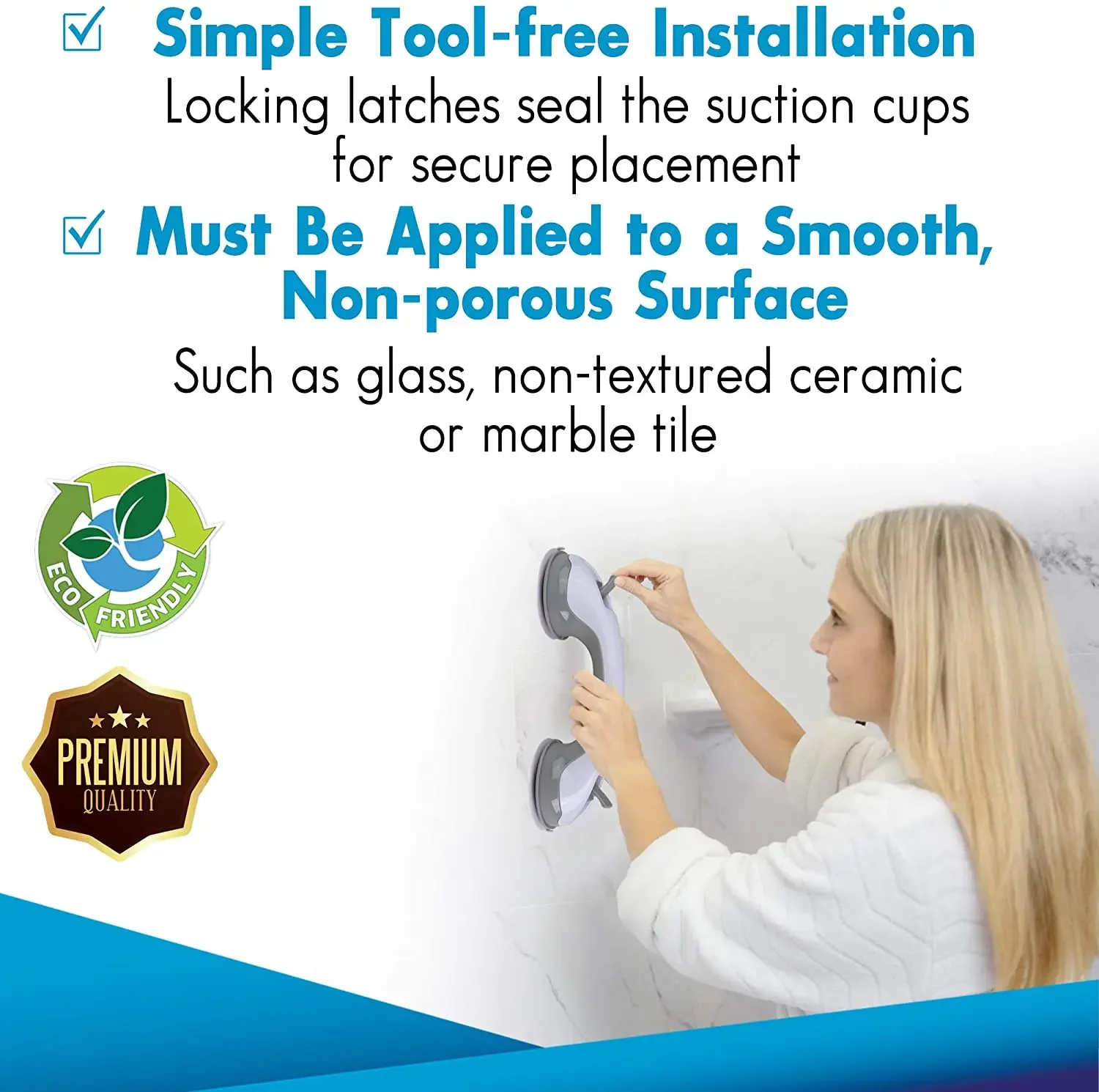 - STABILITÉ DURABLE : En incorporant des ventouses solides et en les associant à notre technologie de loquet de verrouillage, nous vous offrons une puissance d'adhérence maximale. Cette barre d'appui peut se fixer puissamment sur toute surface plane et non poreuse, telle que : CARREAUX / ACRYLIQUE / VERRE.